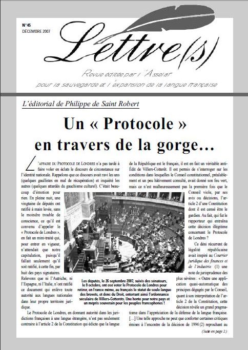 - Un protocole en travers de la gorge, éditorial de Philippe de Saint Robert